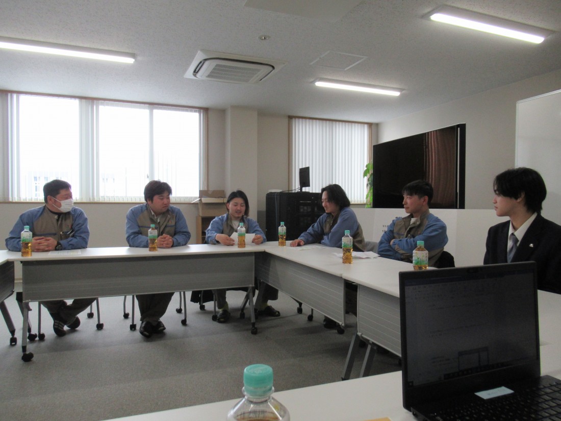 現場の方を招いて、現場の様子や仕事の進め方について話を聞きました。現場配属はまだまだ先ですが配属後にスムーズに業務に取り組めるように、会社全体でサポートしていきたいなと感じました。